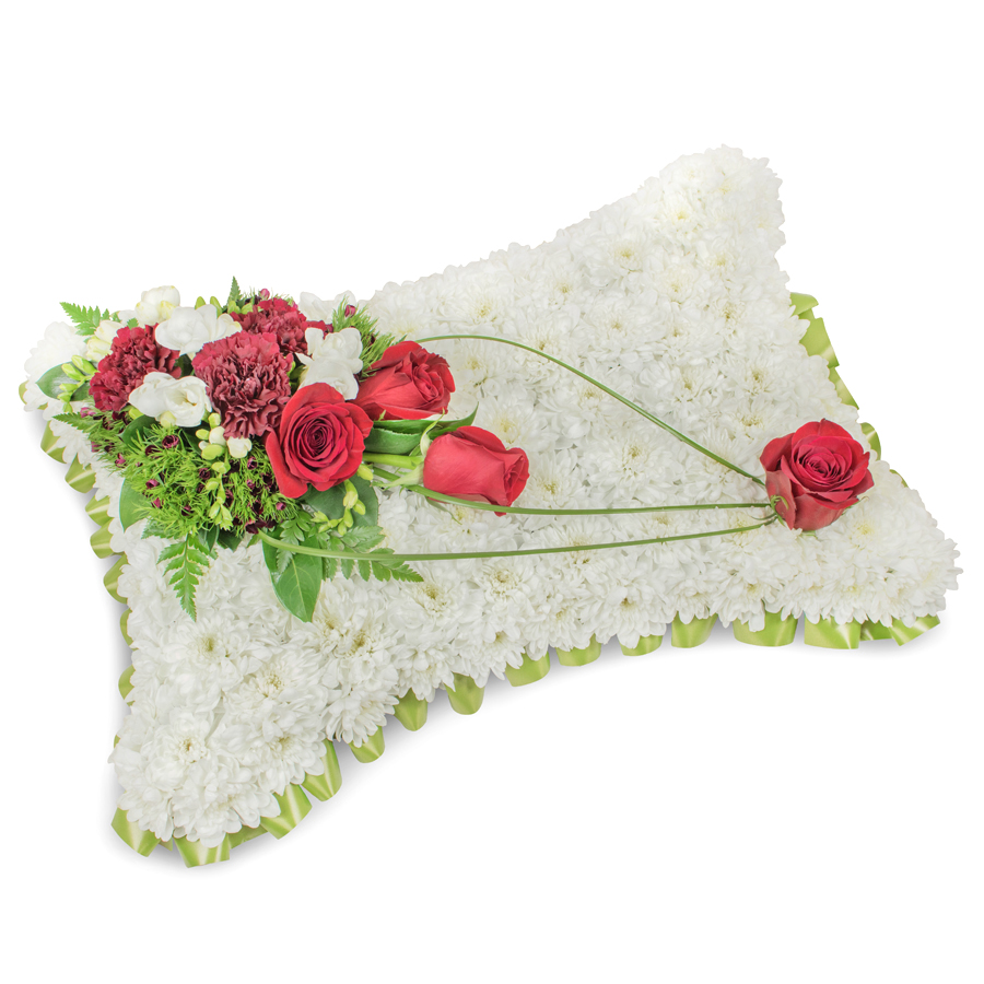 Express heartfelt sympathy with the Sincerest Sentiments Cushion, a beautifully crafted funeral flower tribute available from Flowers Potters Bar in Potters Bar. This elegant cushion arrangement features pure white chrysanthemums as a soft base, thoughtfully accented with rich red roses, dark red carnations, delicate white freesias, dianthus and graceful bear grass for a refined finish.
